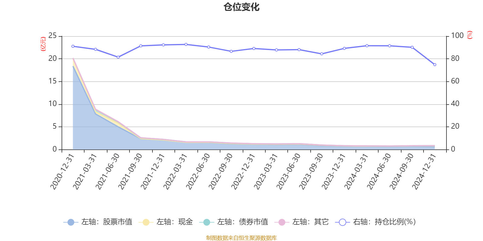 据定期报告数据统计,近三年平均股票仓位为88.05%,同类平均为83.34%。2022年一季度末基金达到92.72%的最高仓位,2024年末最低,为74.88%。